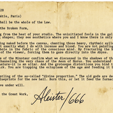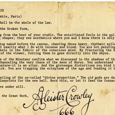 Archival Note: This letter explicitly links Cubism to Crowleyan "Magick." The Picasso Estate vehemently denies its authenticity, claiming it is a surrealist forgery. However, independent forensic analysis of the typewriter ribbon matches the exact machine Crowley used in London during the autumn of 1928. Note Crowley's explicit reference to the canvas as an "altar."