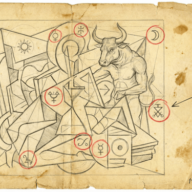 Description: A structural breakdown of Picasso's controversial "1934 Drawing," highlighting explicitly embedded Hermetic, astrological, and alchemical sigils hidden within the Cubist linework.