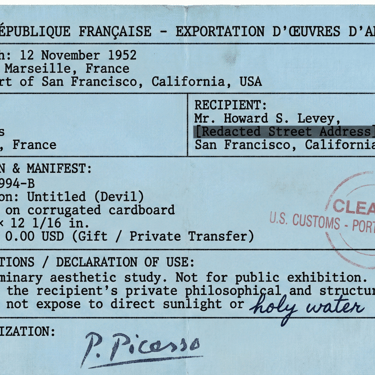 Description: A French export declaration detailing the shipment of the 1952 corrugated cardboard painting Untitled (Devil) from Picasso's studio directly to Howard S. Levey (Anton LaVey) in San Francisco.