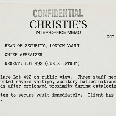 Archival Note: This document proves that the "curse" of Picasso's work is a known phenomenon within the high-end art world. The memo orders the painting to be removed from public view after staff members experienced "severe vertigo, auditory hallucinations, and nosebleeds" while cataloging it. The location of "Lot 492" is currently unknown.