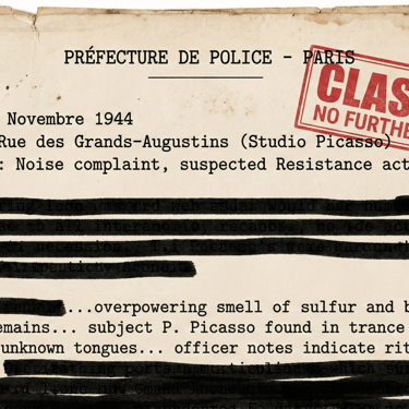 Archival Note: The unredacted sections describe an "overpowering smell of sulfur," "animal remains," and the artist discovered in a "trance state, speaking unknown tongues." The incident was dismissed as "suspected Resistance activity," but the officer's notes indicate a "ritualistic setup." This document is key evidence of Picasso's wartime occult practices.
