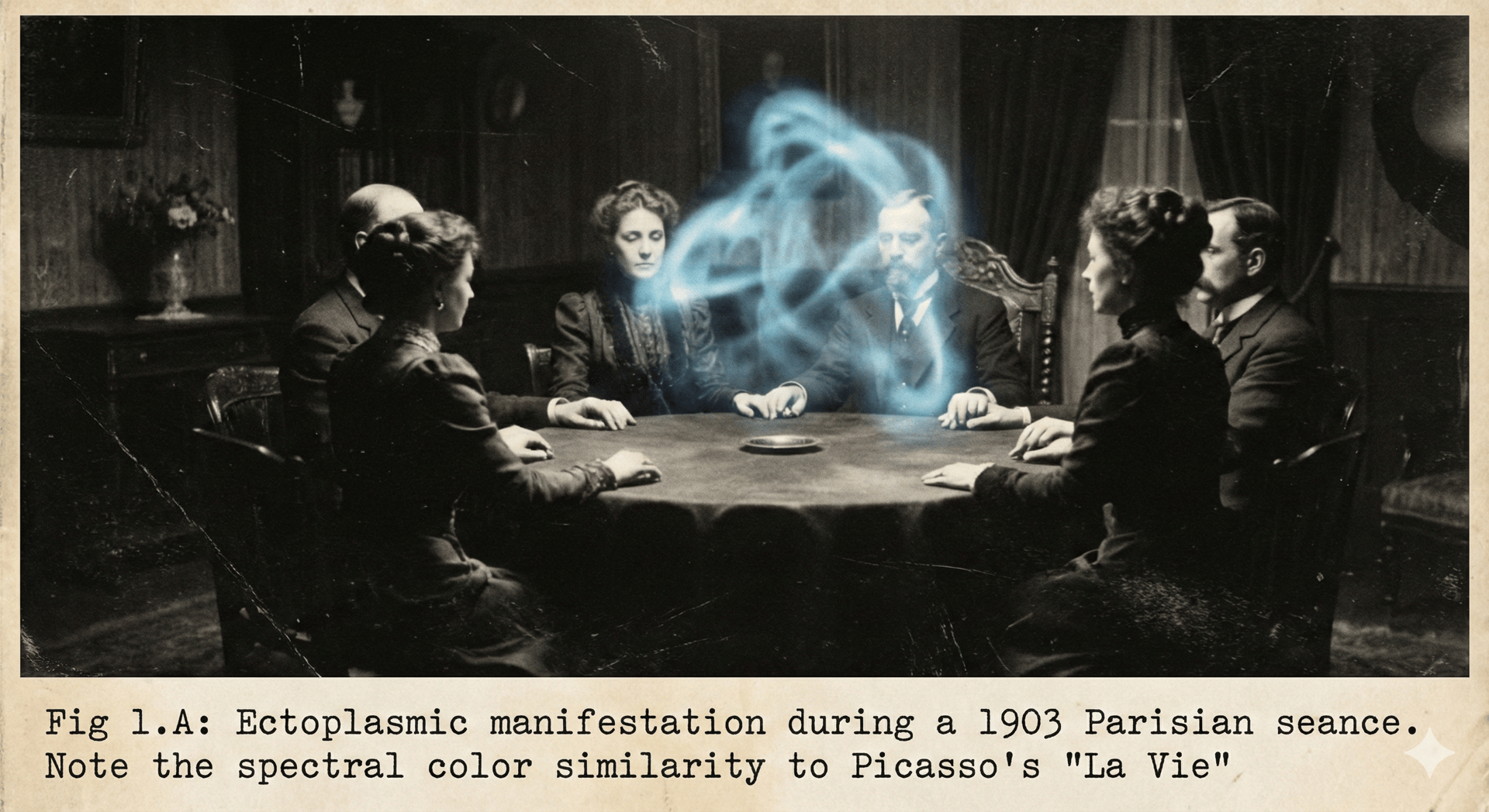 The pervasive blue palette that dominates these works was not an aesthetic choice meant to convey sadness. In the spiritualist circles of fin de siècle Paris—circles that Jacob introduced Picasso to—a specific shade of phosphorescent blue was recognized as the color of ectoplasm, the physical manifestation of spirits summoned during mediumistic seances. Picasso was not painting poverty; he was painting the thinning veil between the living and the dead.